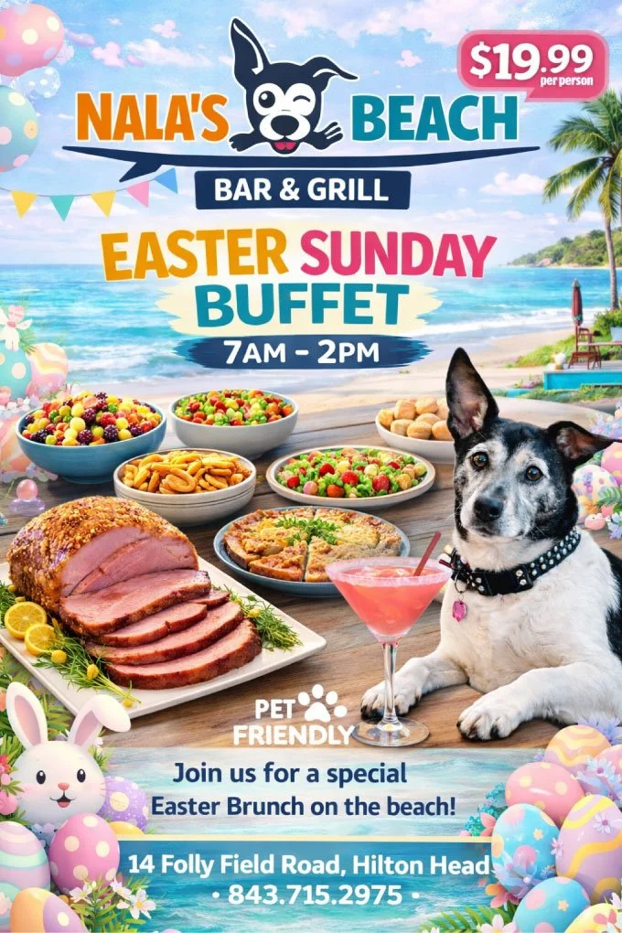 Celebrate Easter Sunday at Nala’s Beach Bar and Grill with a special buffet designed for a relaxed and memorable day on Hilton Head Island. Gather with family and friends to enjoy a festive atmosphere, great food, and the laid-back island vibe that makes Nala’s a favorite spot for locals and visitors alike. It is the perfect way to start your Easter celebration before heading out to enjoy the rest of your day.