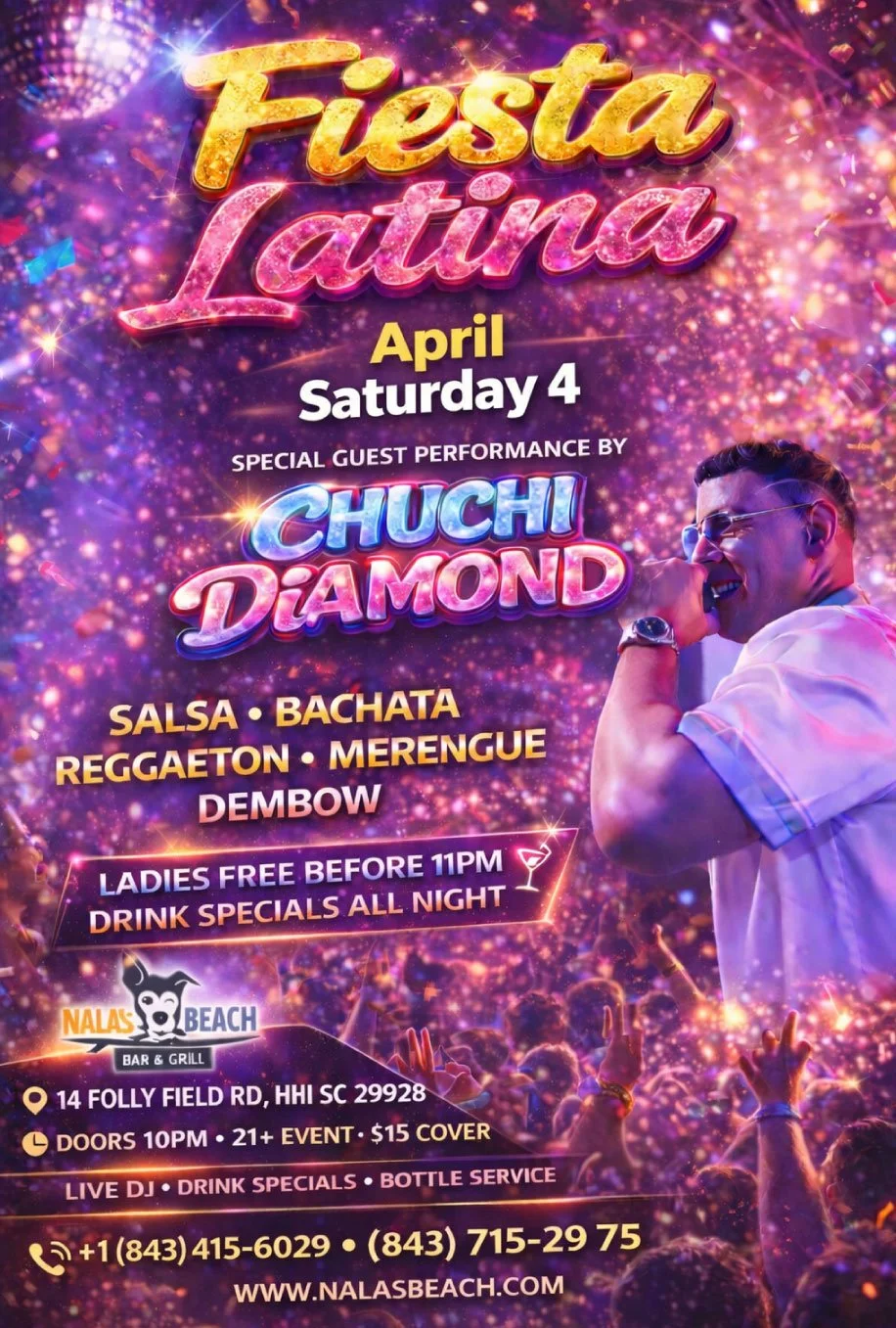 Get ready for an unforgettable Latin Party on Saturday, April 4 at Nala’s Beach Bar and Grill in Hilton Head Island.