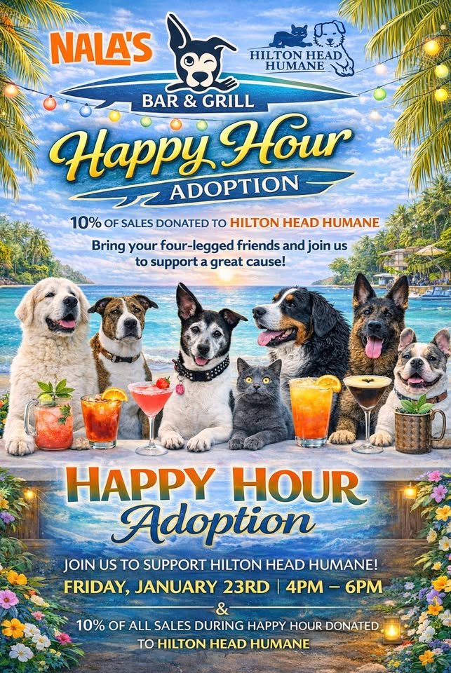 Nala’s Bar & Grill is pleased to host a Happy Hour Adoption Event in support of Hilton Head Humane. Join us for an engaging afternoon featuring signature cocktails, a welcoming atmosphere, and the opportunity to support animals in need.